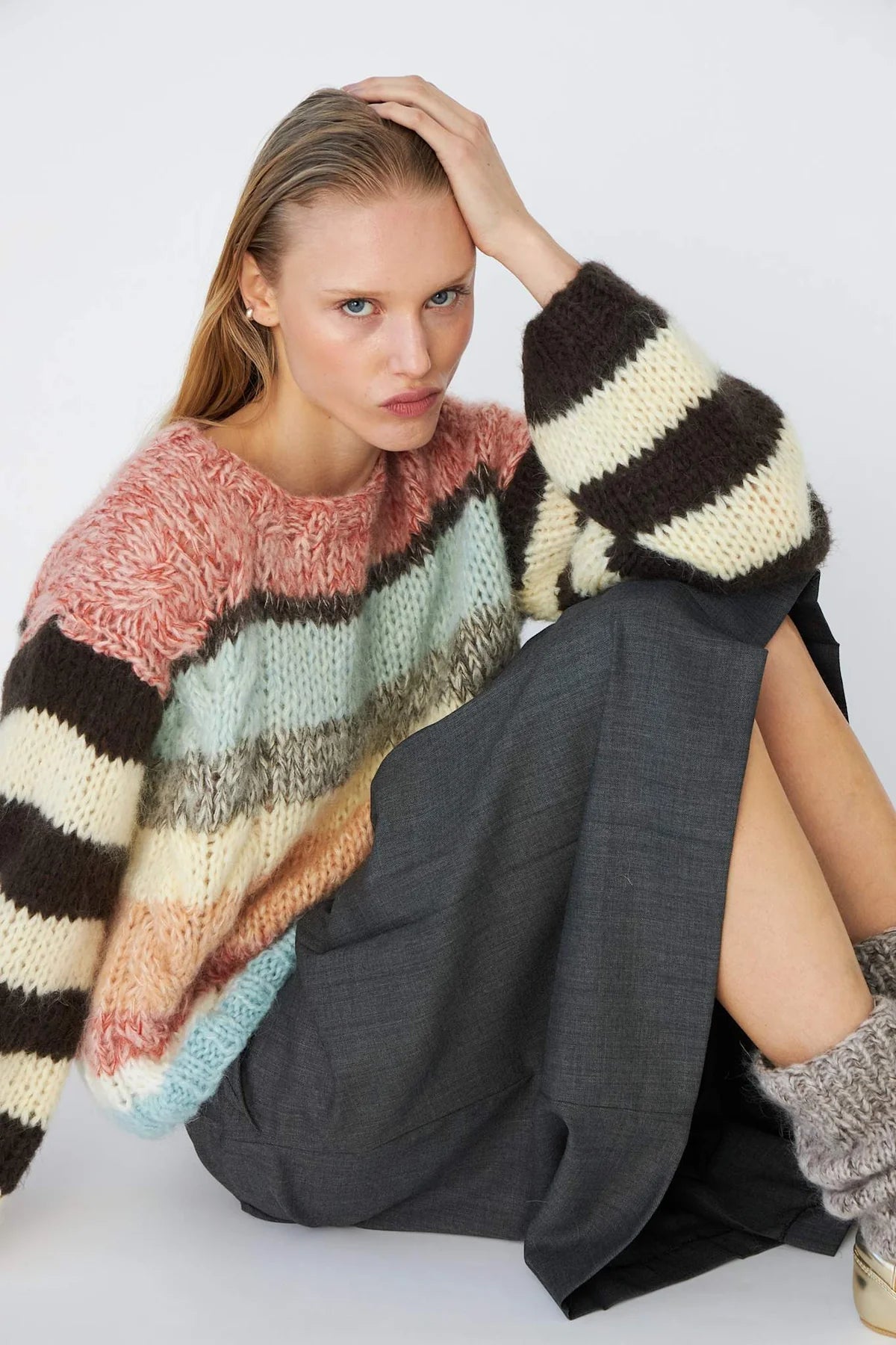 BEATE is a bold hand knitted pullover with a relaxed fit and a slightly cropped length. Designed with wide sleeves and a round neckline, it offers a soft silhouette and easy wear. This piece is hand knitted by Italian women working from their homes in Tuscany. An exclusive Italian hand knit that reflects the heart of the DAWNxDARE identity - rooted in craftsmanship, color and individuality.