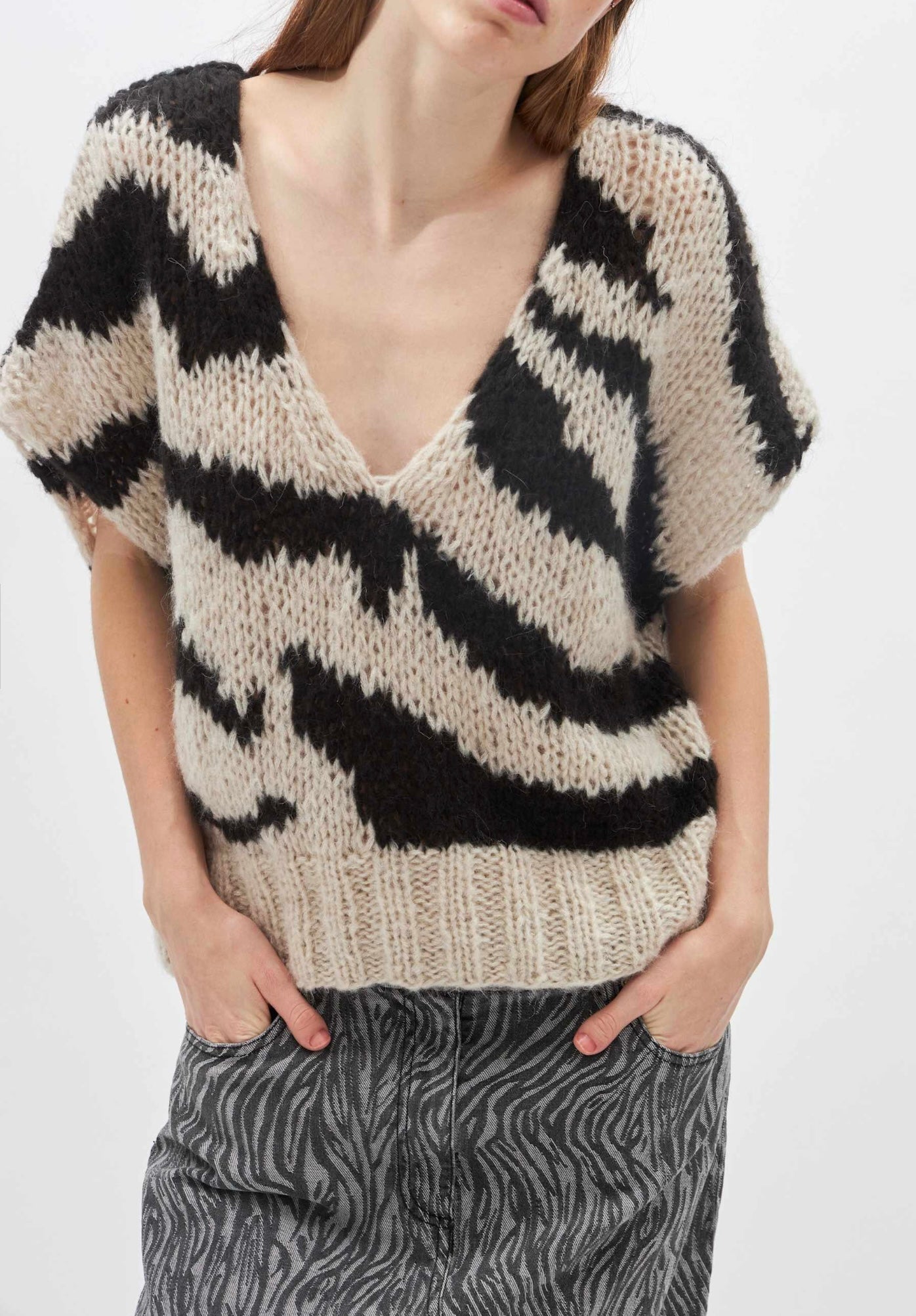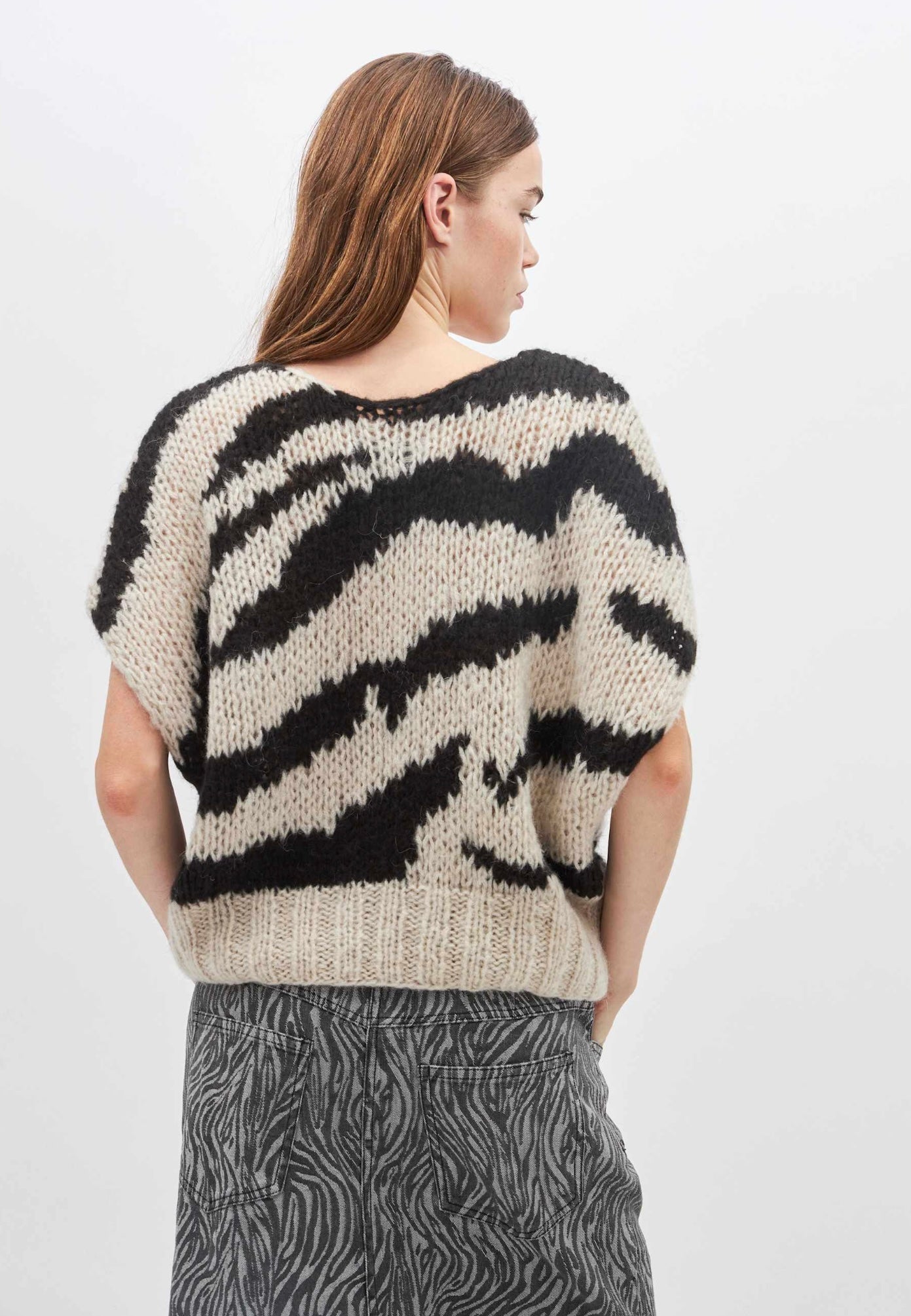 CAPRI ZEBRA is a new handknitted waistcoat with zebra look. The waistcoat has straight arm holes and a rib at hem.
