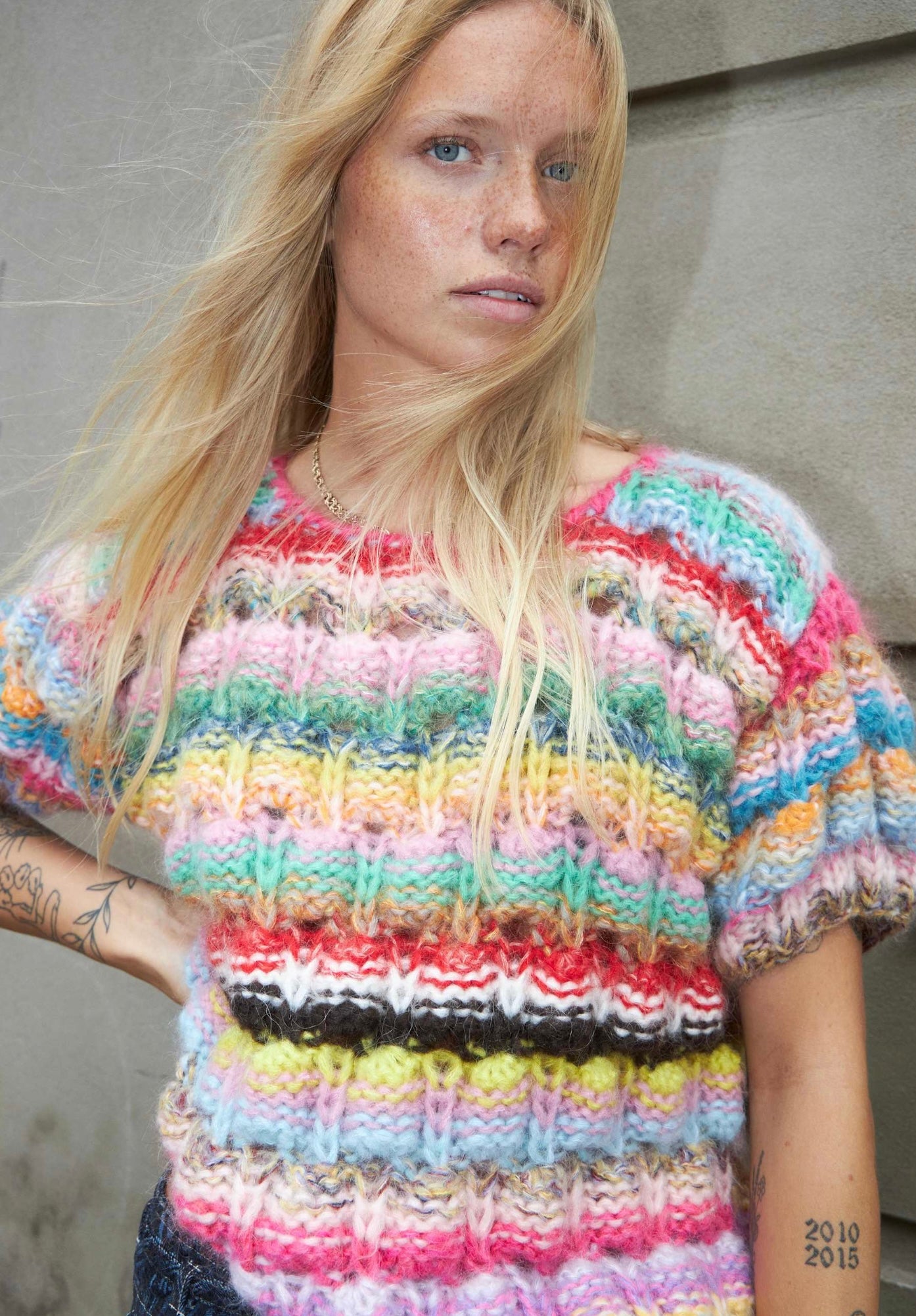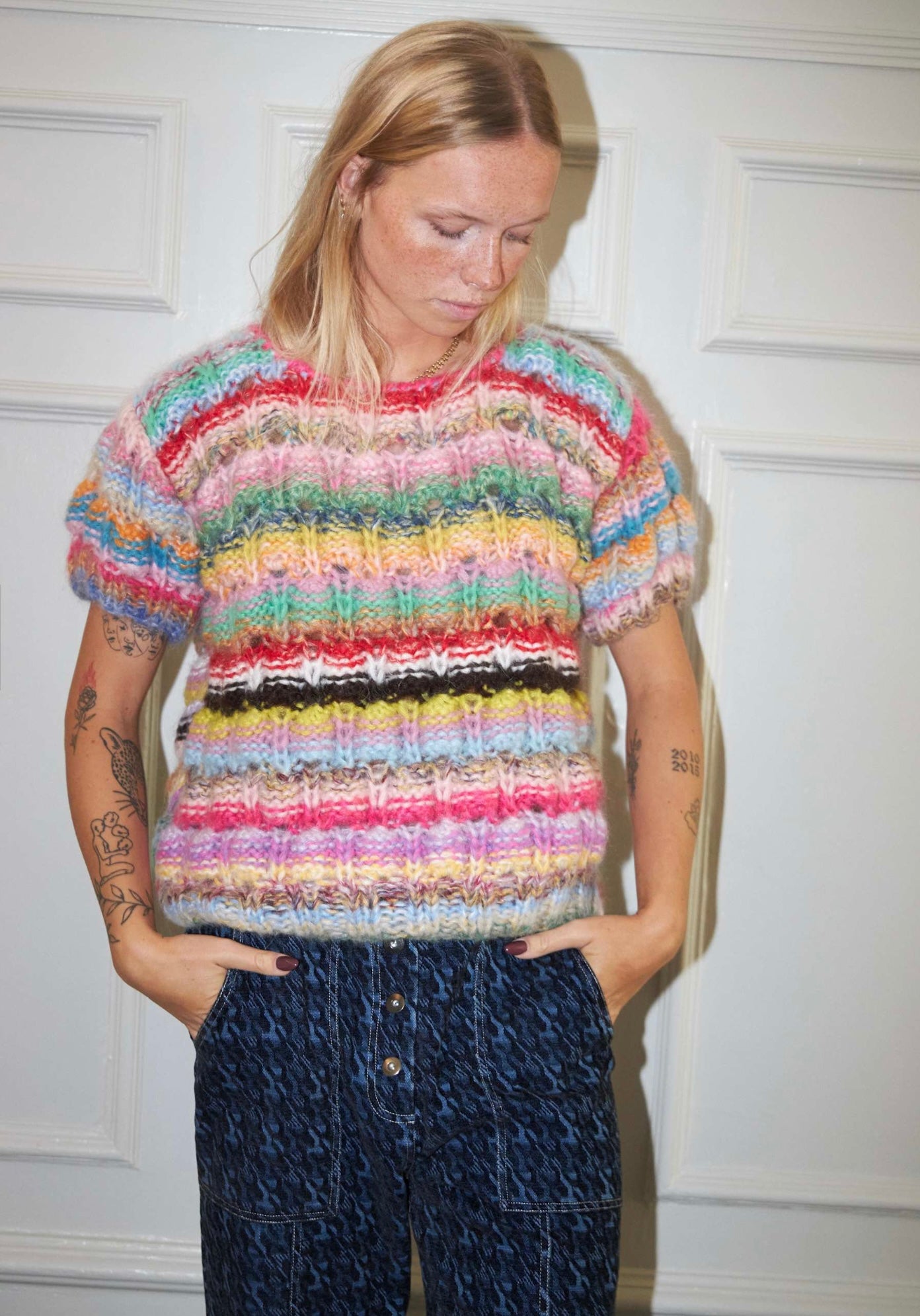 The top is part of our deadstock collection which is made from leftover yarn. This way we create sustainable knitwear by not setting up new production but by using what is already in stock. All knits are therefore different in color combination - not two are identical - and all styles are numbered by hand.