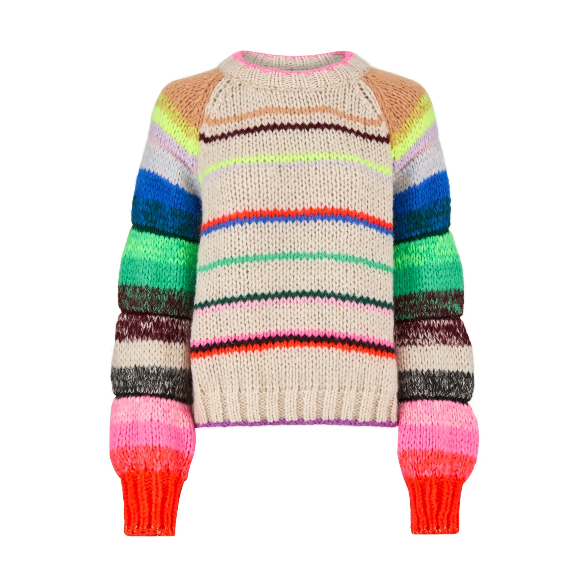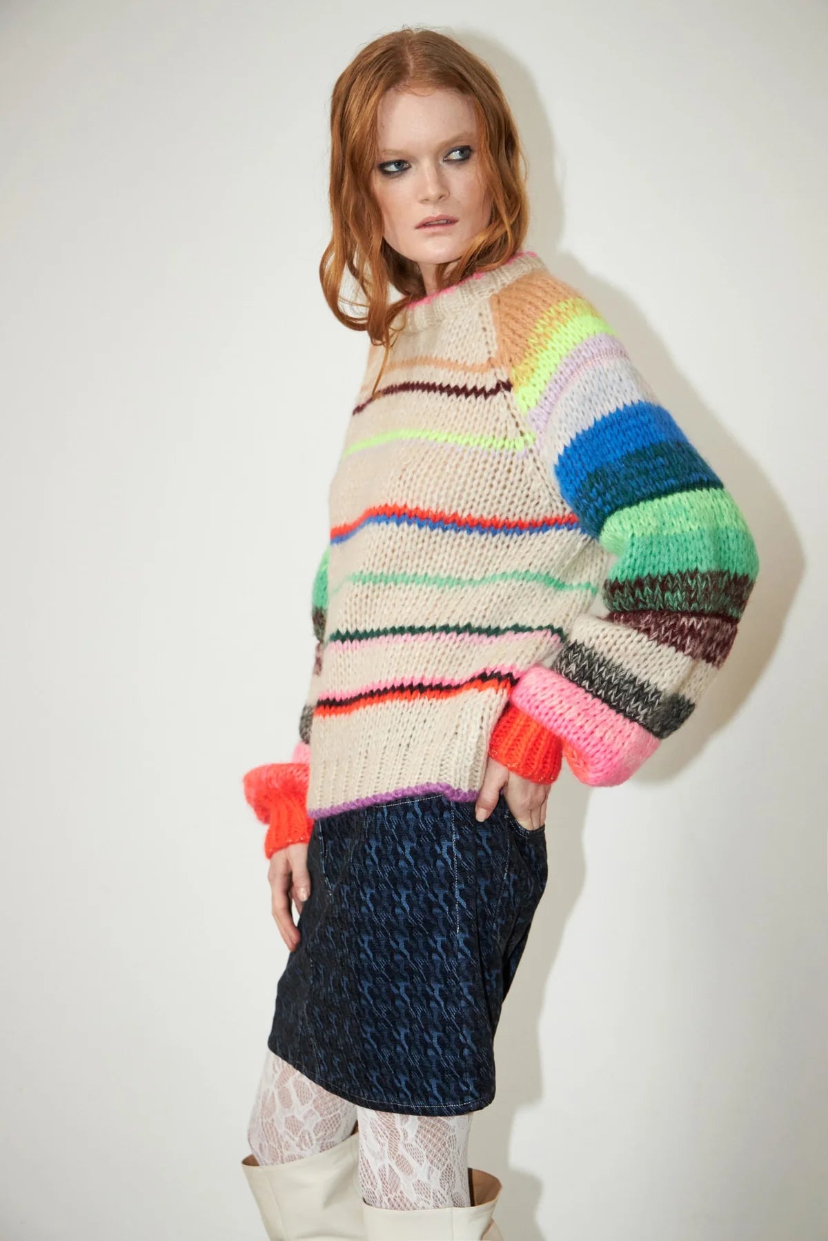 FAWN MULTI is a multi colored knit with a loose silhouette. It has a round neck with a folded rib edge and raglan sleeves with a few stripes and a slightly elastic effect which makes it stand out.