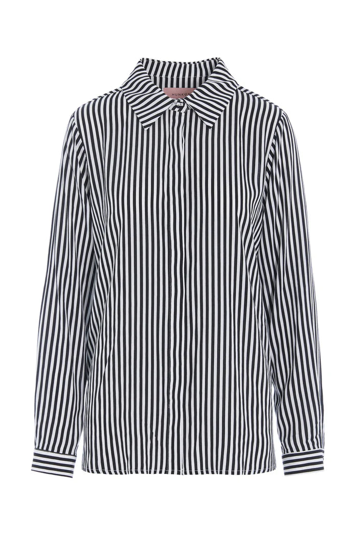 Skjorten har usynlig knaplukning langs fronten og manchetter på de lange ærmer.