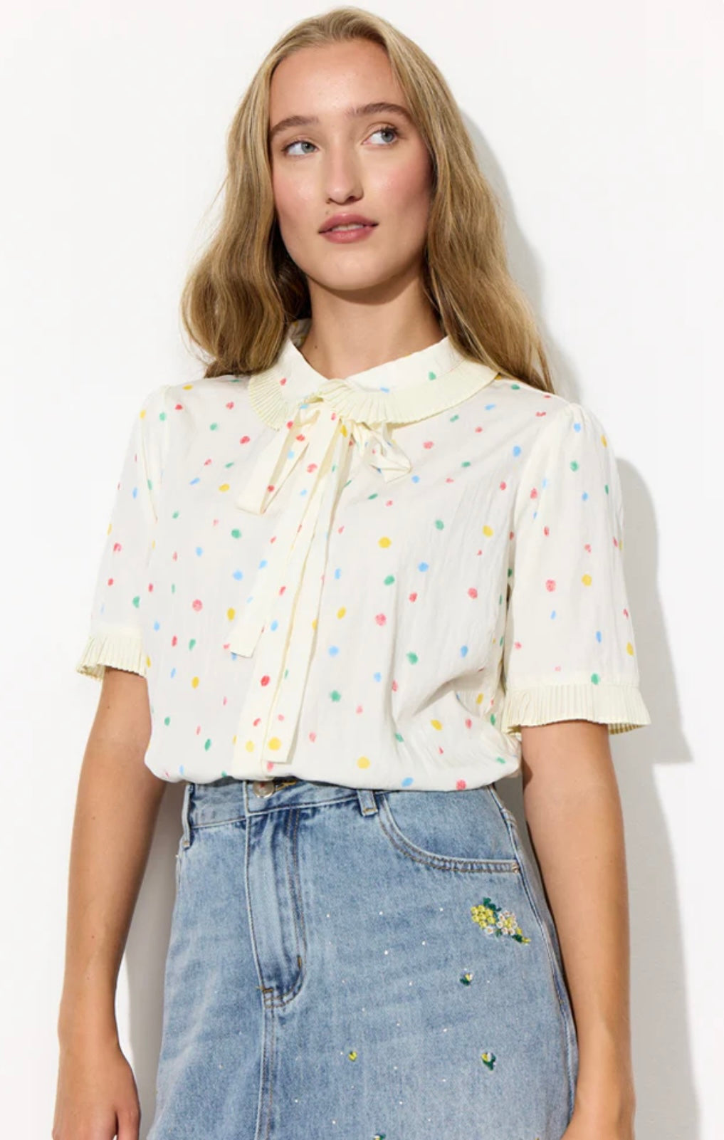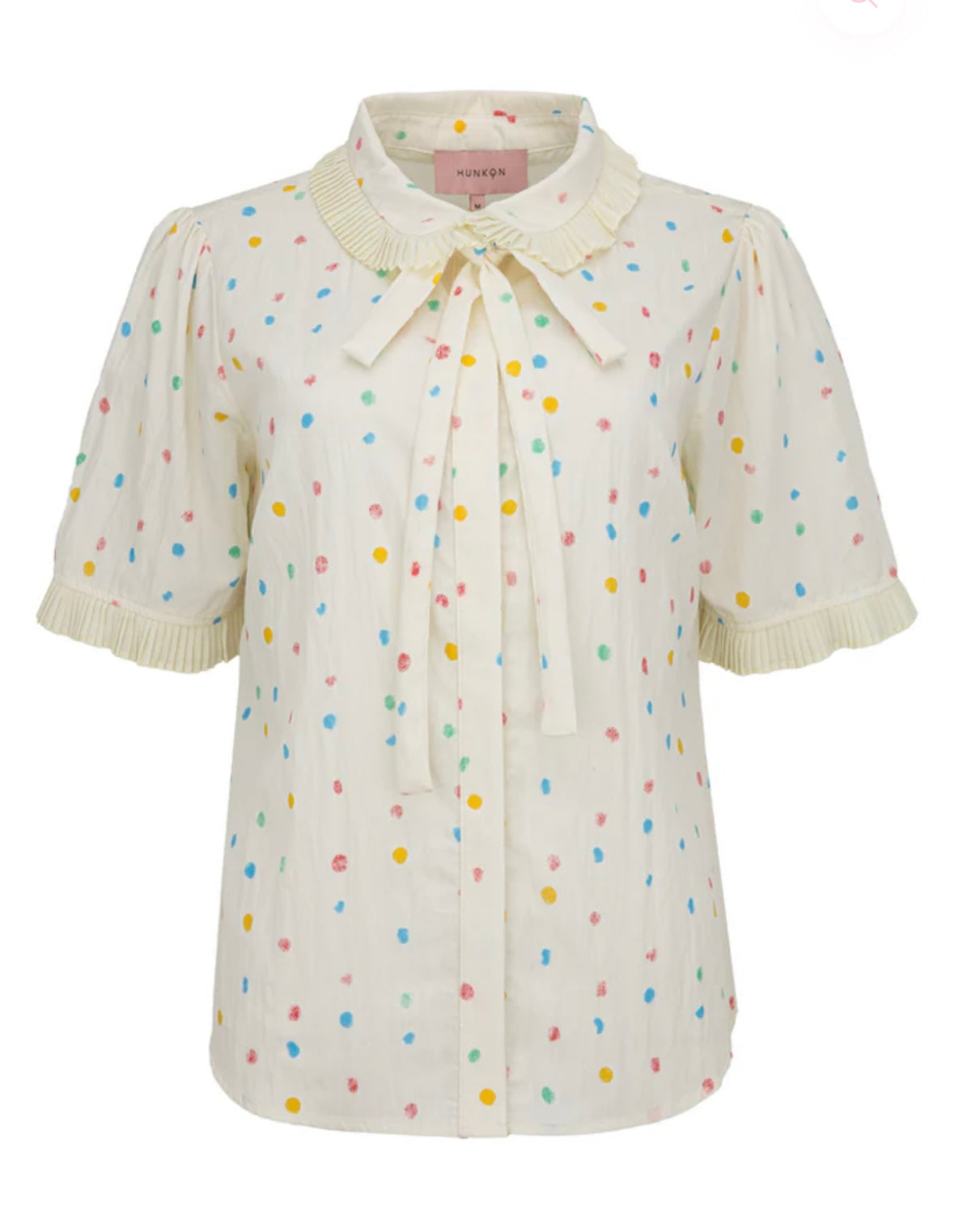 Hunkøn Martha Shirt is a delicate short-sleeve shirt with a fine pleated edge at the collar and sleeve.