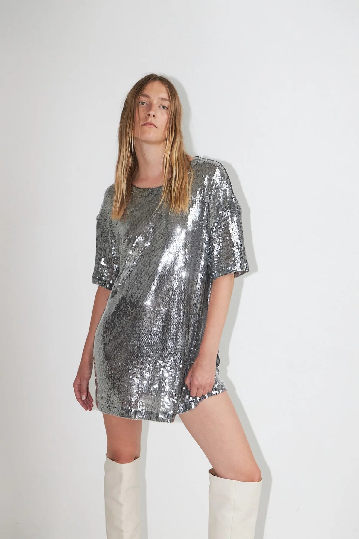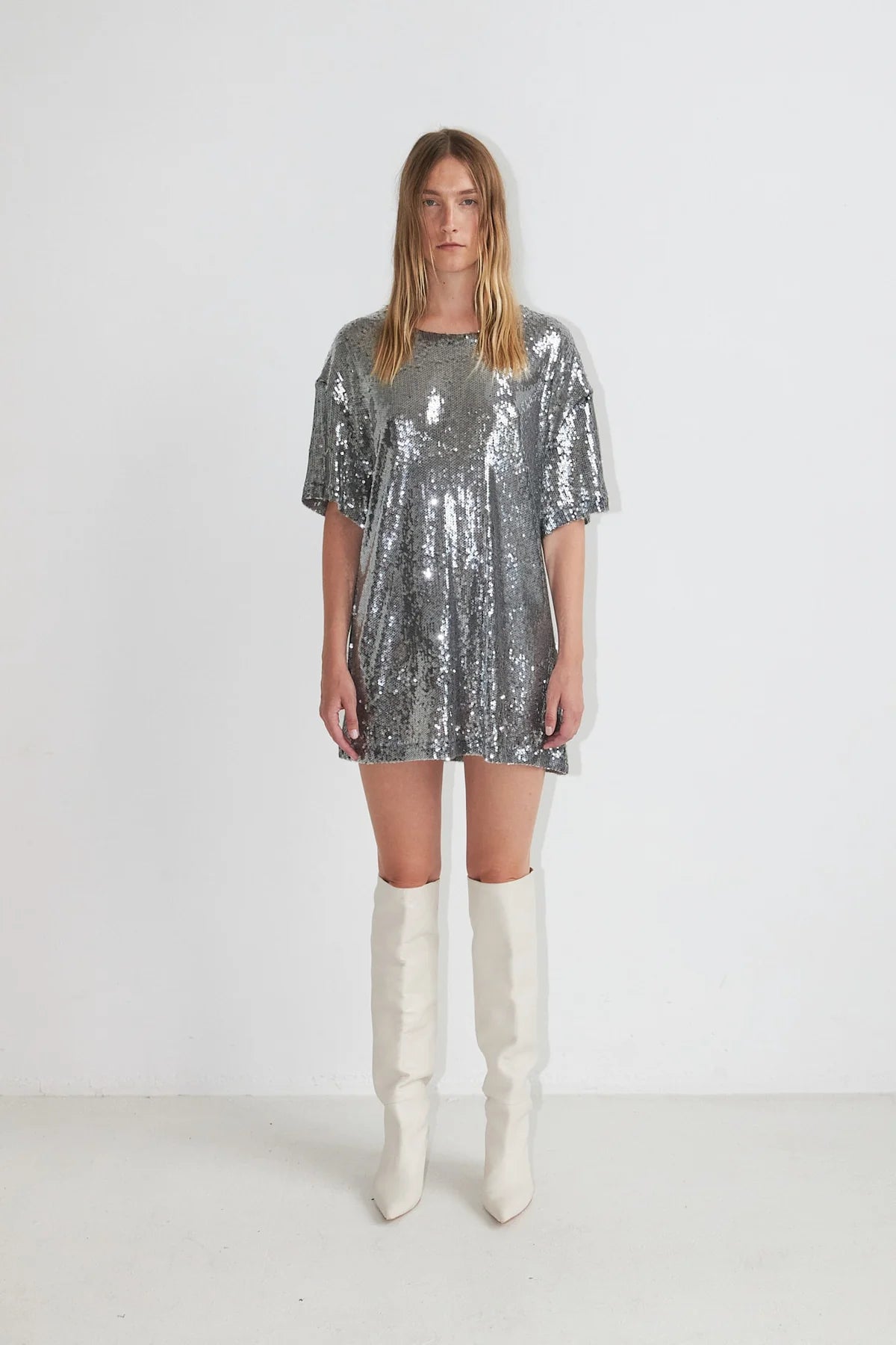 Fierce is an oversize sequin tee with round neck and short sleeves.